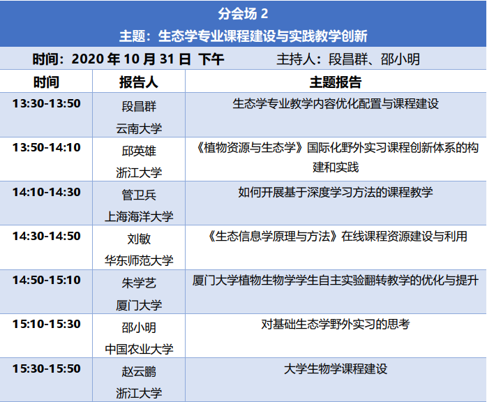 会场二围绕“生态学专业课程建设与实践教学创新”为主题开展报告和讨论。云南大学段昌群教授、浙江大学邱英雄教授、上海海洋大学管卫兵副教授、私密直播 刘敏副教授、厦门大学朱学艺副教授、中国农业大学邵小明教授、浙江大学赵云鹏教授做主题报告。作为生态学专业的育人核心,课程建设和实践教学创新是生态学专业教师最为关心的话题,会场的7个报告从不同角度分析了生态学专业人才培养的特色和困境,并提出了相应对策和举措。