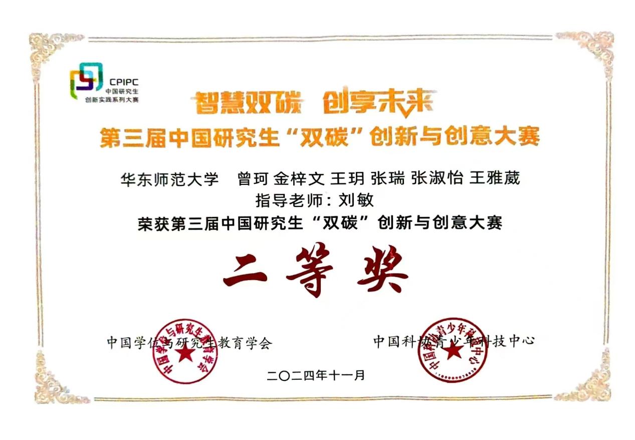 2024年11月22-24日,第三届中国研究生“双碳”创新与创意大赛决赛在武汉理工大学举行。私密直播 私密直播 由刘敏老师指导,曾珂领队,金梓文、王玥、张瑞、张淑怡、王雅葳同学参与的《城市绿意寻踪:探索生态人文视角下的城市生态空间价值实现之旅——以上海市闵行区吴泾镇为例》项目荣获全国二等奖。由陆雪琴老师指导,衡世亮领队,吴鑫涛、孙一波同学参与的《“光”“铁”妙用—高效去除抗生素铁基光催化剂的构筑同步耦合生物膜反应器产甲烷装置的研发》项目荣获全国三等奖。