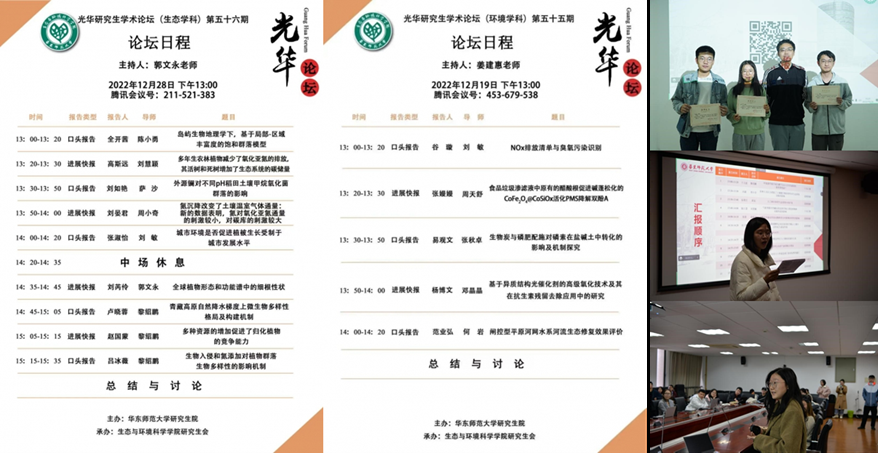 学院依托团委学生会、研究生会、环保公益社团O3协会等学生组织开展丰富多彩的学生活动。院研会以学术活动为主体,文体活动为两翼。通过举办研究生光华学术论坛、丽娃大讲坛、学术沙龙、学术先锋等系列活动,学院内形成了浓郁的学术氛围。结合学院专业特色,在紫竹小学、永德实验小学、闵行社区,开展生态环境教育课程。暑期组织“美丽中国实践团”前往江西上饶、云南姚安、上海崇明等地开展“生态文明在行动”支教活动。院团委被评为校五四红旗团委,院研会被评为校红旗研会。