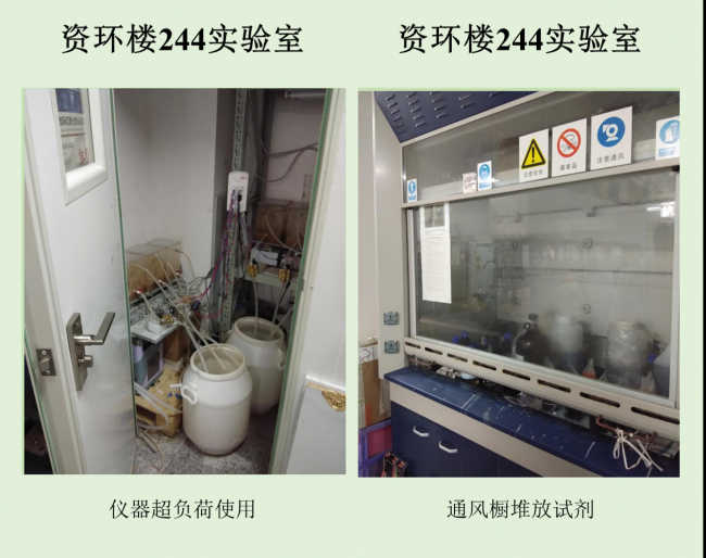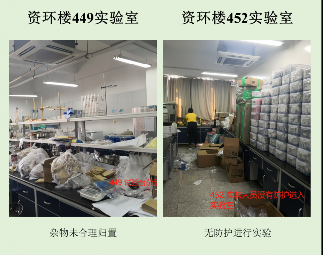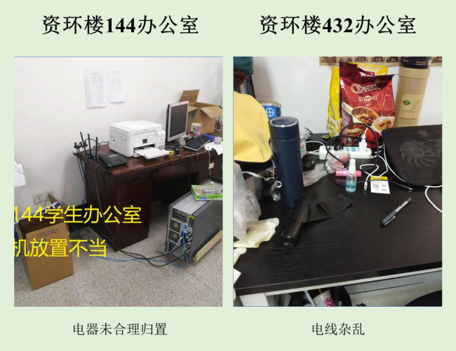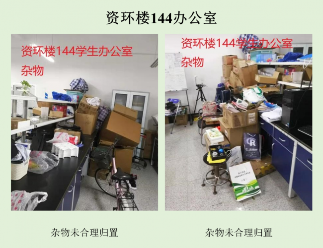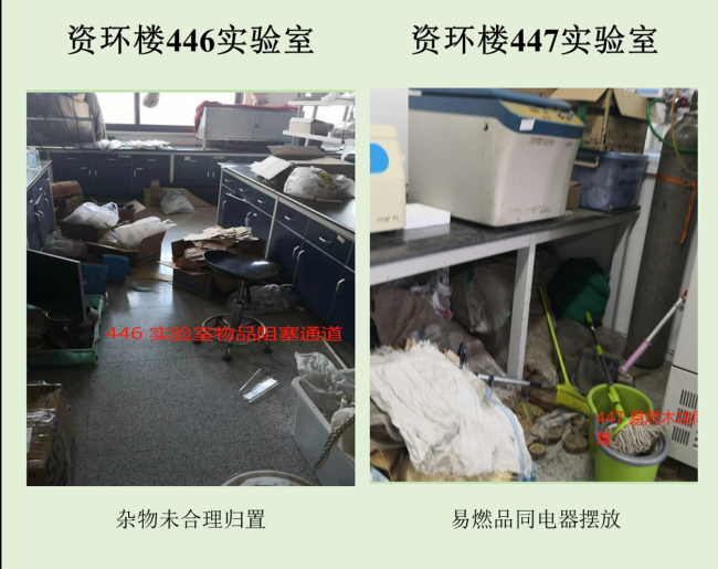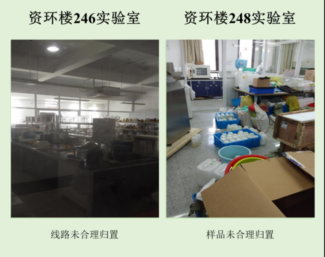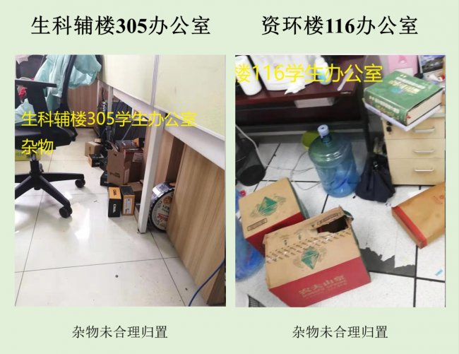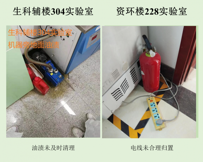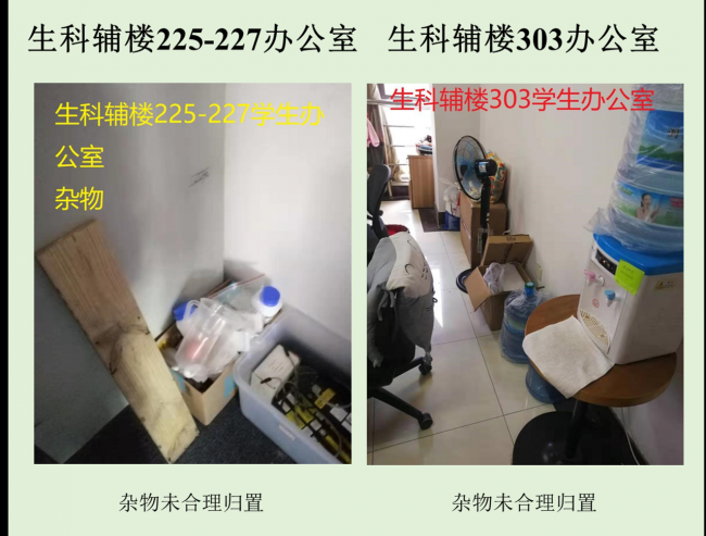 本次检查中几乎所有学生办公室和实验室都存在着大大小小的安全隐患,其中最差学生办公室依然是生科辅楼一楼113室,最差实验室为资环楼446,在此批评。检查中发现最普遍的问题仍旧是堆放杂物,其他明显的问题有接线板乱拉乱放、做实验穿着不当等,极个别实验室带入食物的现象。希望老师和同学们认识到安全问题的严重性,多加重视与防范,发现问题及时改正!