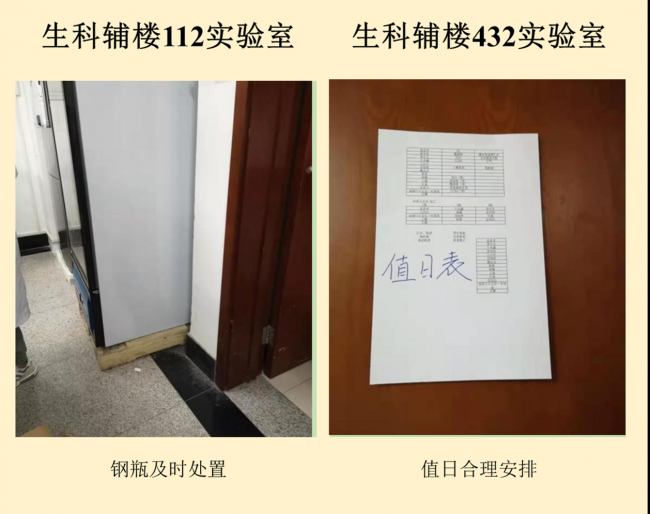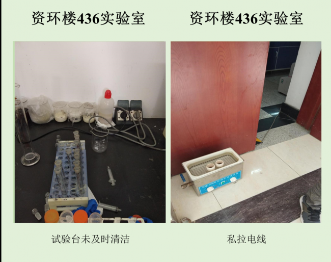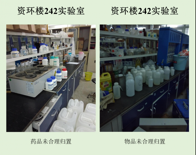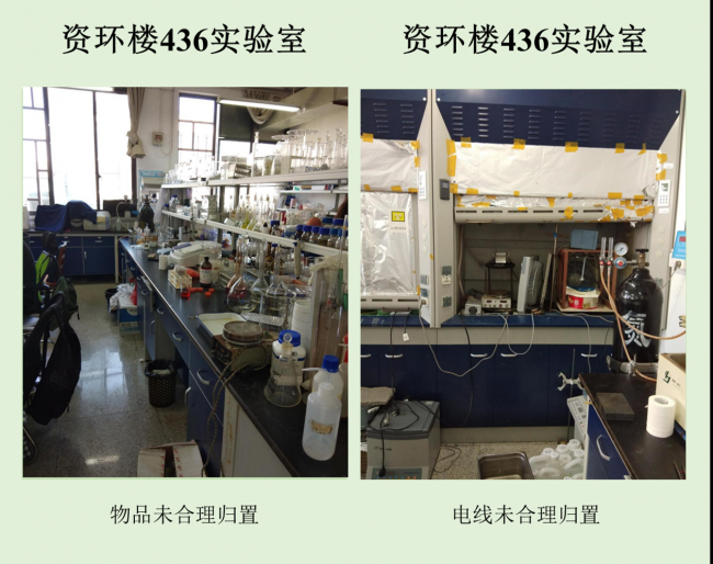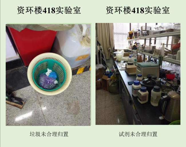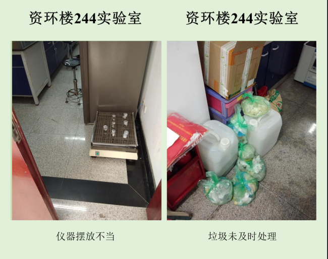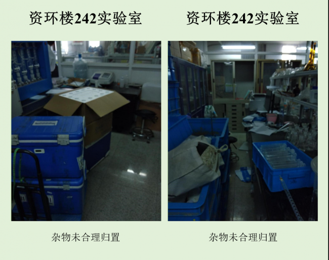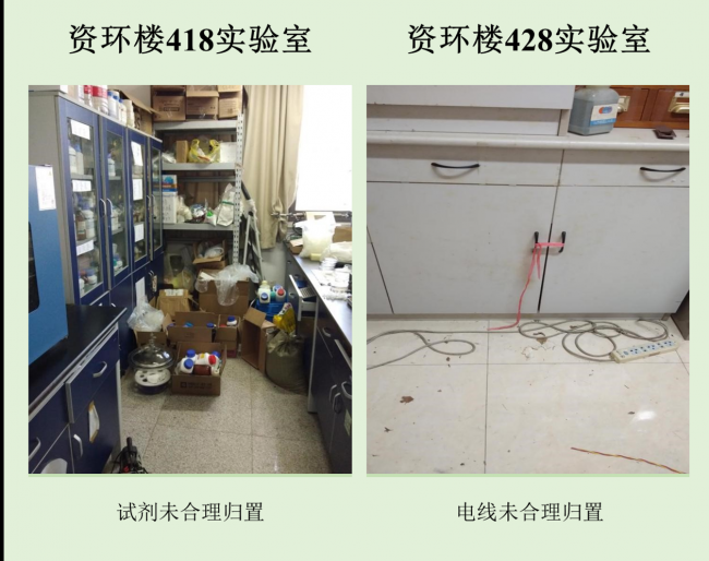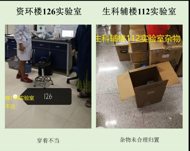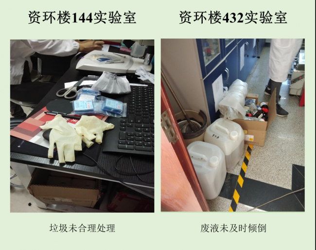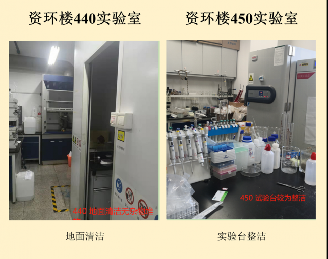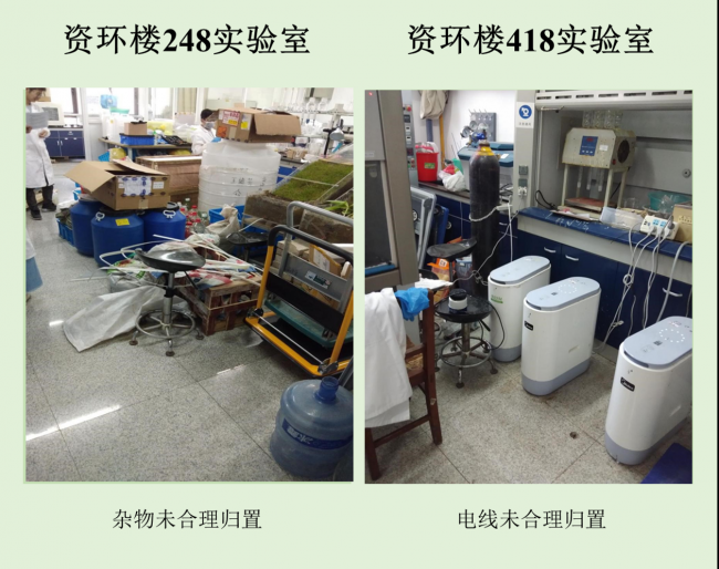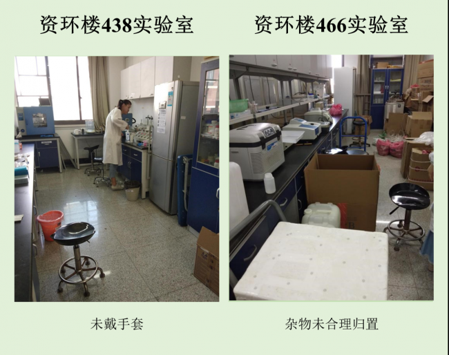 在本次检查的实验室中,资环楼142情况最佳,资环楼446室情况最差。小卫士们总结发现,实验室的评分除了整洁程度影响外,也受实验人员穿着、操作是否规范的影响。老问题如实验试剂,物品随意摆放,电线缠乱,做实验不带手套不穿实验服等有待解决,新问题如实验室带入食物,私拉电线,地面油渍溢出等需要重点关注。另外特地表扬生科辅楼112将值日表,角落堆放钢瓶等问题,生科辅楼302插座串接问题得到整改,生科辅楼309新配备实验垃圾和生活垃圾桶,建议其他实验室效仿,减少垃圾到处丟置现象,生科辅楼309,资环楼228,440,450,458台面清洁整体尚可。