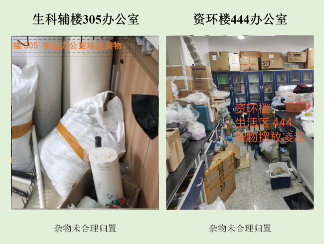 学生办公室安全方面,大部分给人整体印象为合格,个别学生办公室较杂乱,冰箱/一水及旁有易燃物,需要加强防范意识,并及时改正。其中生科辅楼305(刘文亮、陈雪初、伏玉玲)和资环楼444(阎恩荣)为差,特别是资环楼444(阎恩荣)三项评价指标均未达标,需要整改。