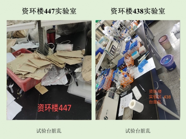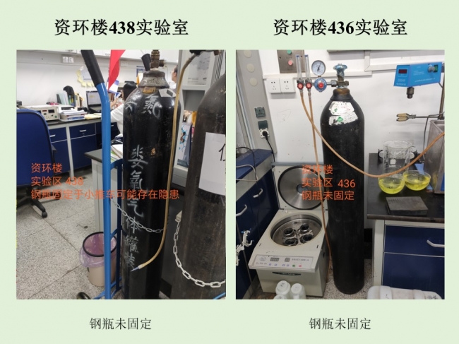 实验室安全方面,生科辅楼307实验室(张秋卓)整体印象为非常优秀,资环楼436实验室(赵雅萍)整体印象为差,其余均为合格。主要问题有钢瓶未固定,废液(实验垃圾)未及时倾倒,实验过程安全防护不到位以及操作台杂乱等。