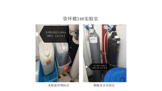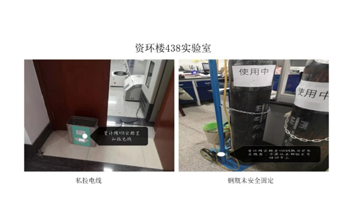 本次检查中几乎所有学生办公室和实验室都存在着大大小小的安全隐患,其中最差学生办公室是资环楼366室,最差实验室为资环楼448室。检查中发现最普遍的问题仍旧是堆放杂物,其他明显的问题有钢瓶未安全固定,实验台物品摆放乱等,极个别实验室带入食物的现象。
