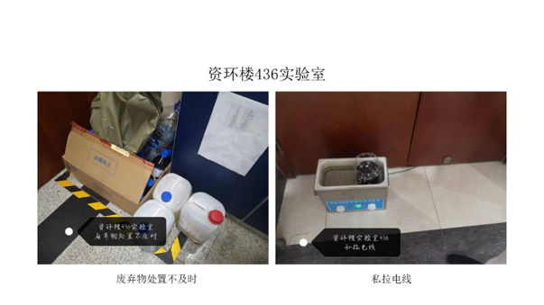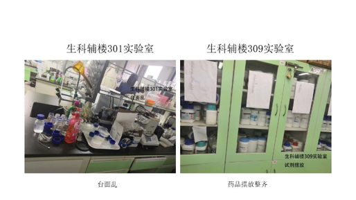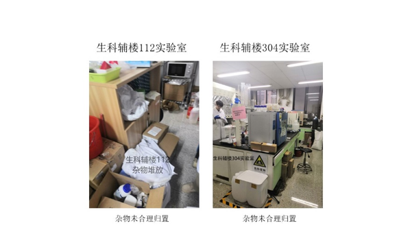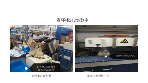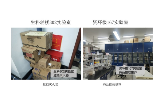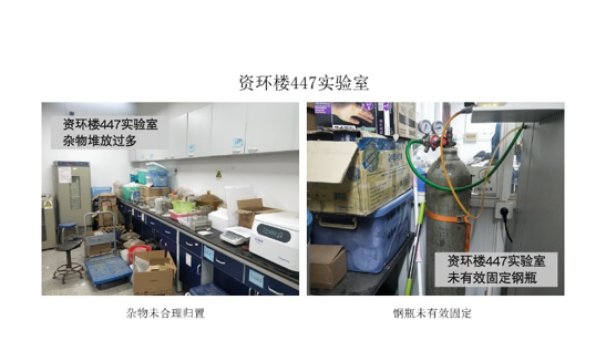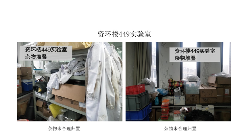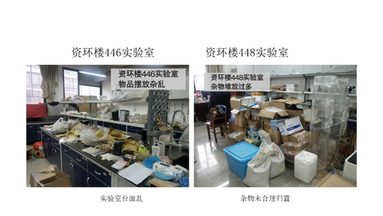 在本次检查的所有实验室中,资环楼126情况最佳,资环楼448室情况最差。本次实验室检查的主要问题为杂物堆放。