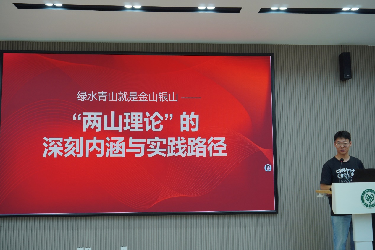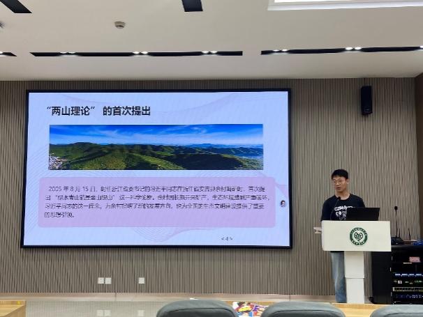 活动在“两山理论诞生的时空密码”主题宣讲中拉开帷幕。孙一波同学以数字沙盘技术还原2005年8月15日习近平总书记考察安吉余村的历史场景,通过对比2003和2023年该地区生态环境指数与经济发展质量关联数据,全景式展现“绿水青山就是金山银山”理论从破茧到蝶变的演进历程。讲解重点围绕“生态优先、绿色发展”的实践导向,深入介绍了以生态保护红线、环境质量底线、资源利用上线为核心的“三线”决策逻辑,指出其在破解“生态-经济”二元悖论中的方法论意义,引发在场环境专业研究生对生态价值核算体系构建的思考,为全体党员上了一堂主题鲜明、内容扎实的生态文明理论课。
