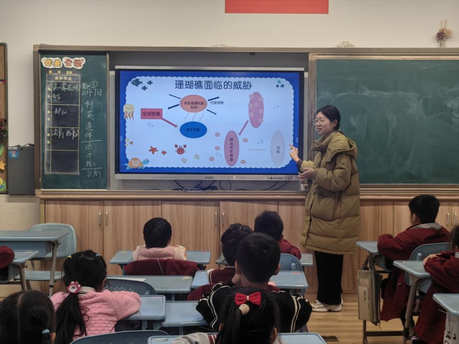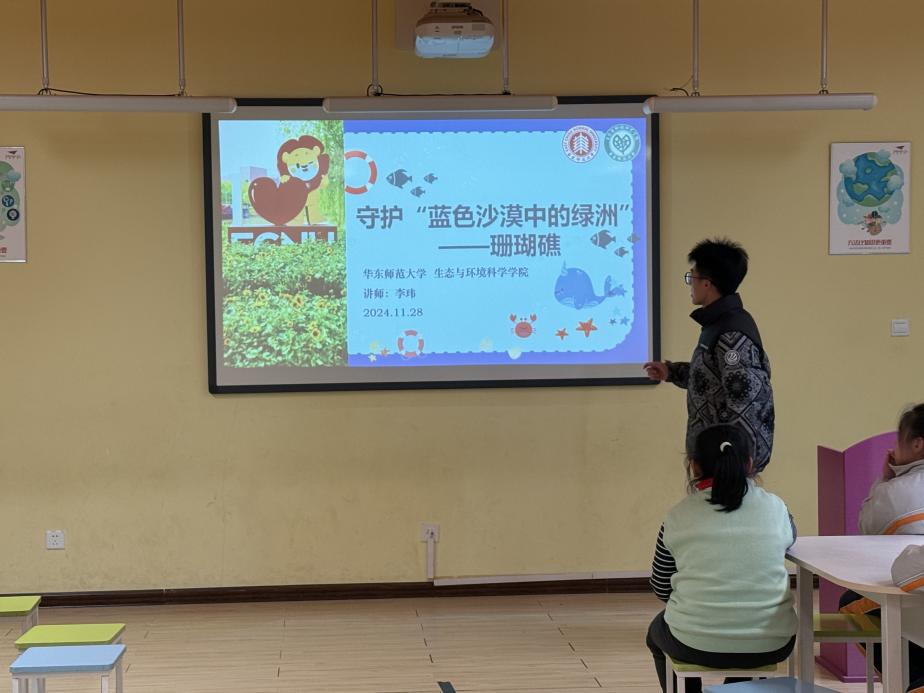 2024年11月26日、27日、28日下午,生态环境小课堂讲师团前往私密直播 附属紫竹小学、永德学校、马桥民办小学开展环教课,本次环教课的主题为“蓝色沙漠中的绿洲——珊瑚礁”,担任本次课程的讲师为王如盈、徐诗雨、张冰然、李玮同学。