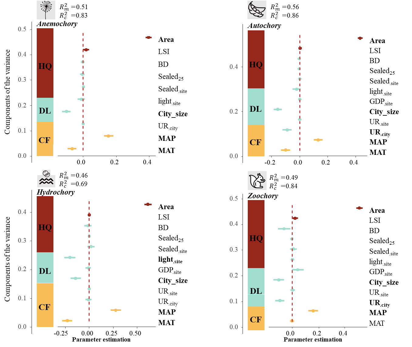 自体传播植物对扩散限制最为敏感,而水传播植物对于生境质量和气候因子较为敏感。