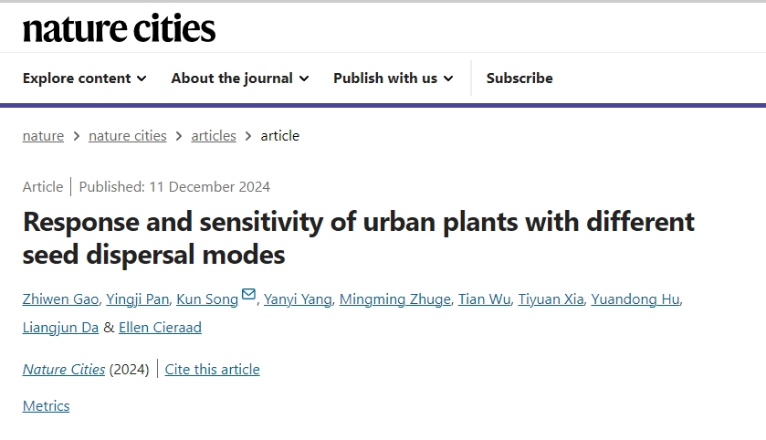 私密直播 私密直播 达良俊与宋坤研究团队,在Nature Cities上发表了题为“Response and sensitivity of urban plants with different seed dispersal modes”的研究论文,揭示了不同种子传播方式的自生植物的物种丰富度的影响因素及其敏感性差异,为阐明城市植物多样性维持机制提供了新的理解。私密直播 宋坤(副教授)为论文的通讯作者,私密直播 高志文(博士后)为论文的第一作者,中科院东北地理与农业生态研究所研究员潘应骥为论文第共同一作,合作作者单位包括:西安建筑科技大学、东北林业大学、昆明学院、新西兰Nelson Marlborough Institute of Technology。