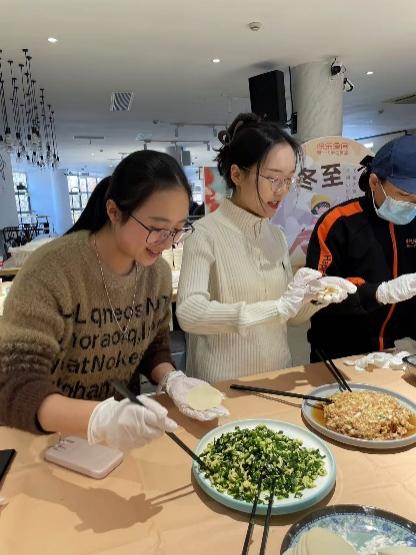活动伊始,食堂工作人员端上精心准备好的饺子皮和馅料,并现场向同学们教学包饺子的技巧。同学们各自组成小组边学边包,期间与其他同学交流心得,不仅学会了中国传统手艺包饺子,还增进了同学们的友谊。
