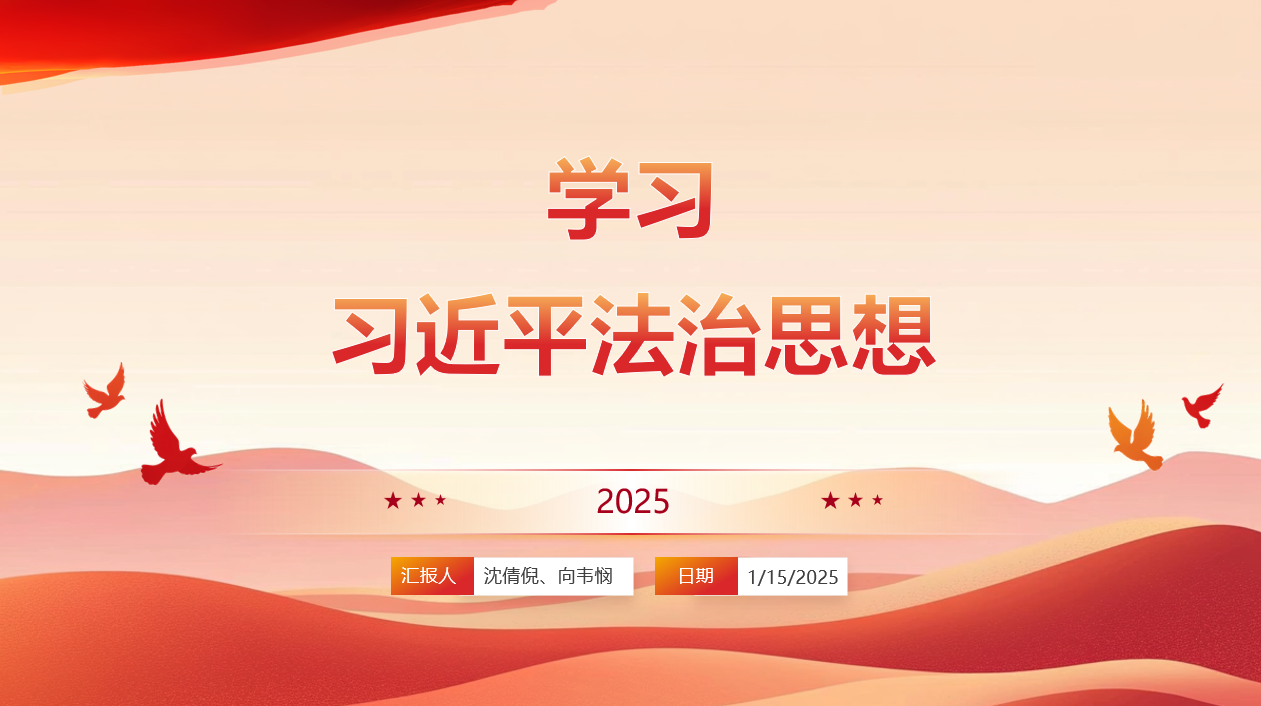 首先沈倩倪和向韦悯向大家分享了学习内容。内容围绕习近平法治思想的形成背景、理论渊源、核心体系以及实践意义展开,全面阐释了该思想的理论深度与现实价值。通过讲解“全面依法治国”“人民主体地位”等核心理念,大家深刻认识到法治在国家治理体系和治理能力现代化中的重要作用。此外,特别强调了习近平法治思想的体系化建设,包括法律规范体系、法治实施体系、法治监督体系、法治保障体系和党内法规体系等内容,剖析了这些体系对法治国家、法治政府和法治社会一体化建设的支撑作用。活动还结合实际案例,深入探讨了法治思想在立法完善、司法公正和全民守法等方面的具体应用。