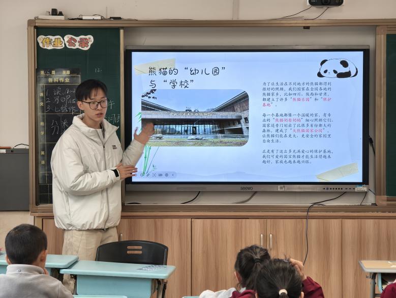 谈及大熊猫的生活与家园,同学们听得格外入神。老师们分享了大熊猫“便便不臭”的小奥秘,并介绍了大熊猫在中国四川、陕西、甘肃的栖息地,指出这片“绿色宝藏”中不仅有大熊猫,还有金丝猴、羚牛等“好邻居”,让同学们明白保护大熊猫的家园就是保护整个生态系统。