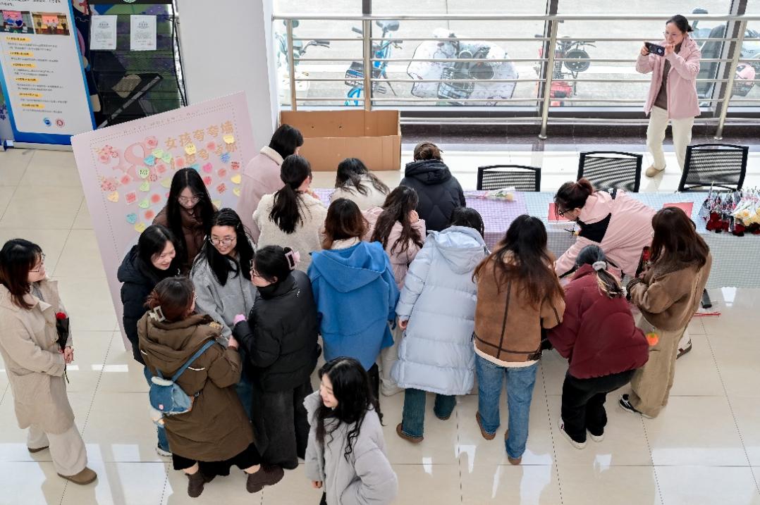 在粉色花朵点缀的“女孩夸夸墙”前,阳光透过玻璃洒在层层叠叠的心形便签上。每一张手写体都跳跃着温度,向最美的她们致以崇高的敬意。