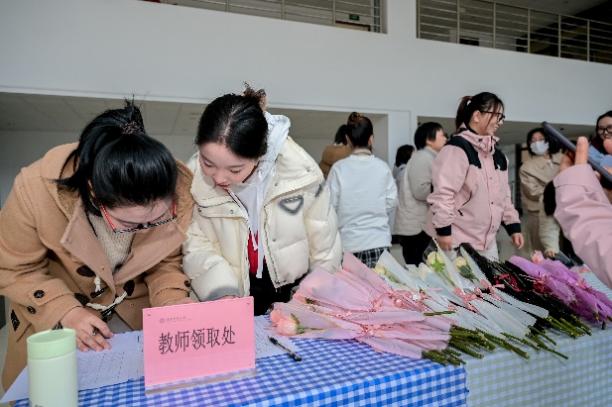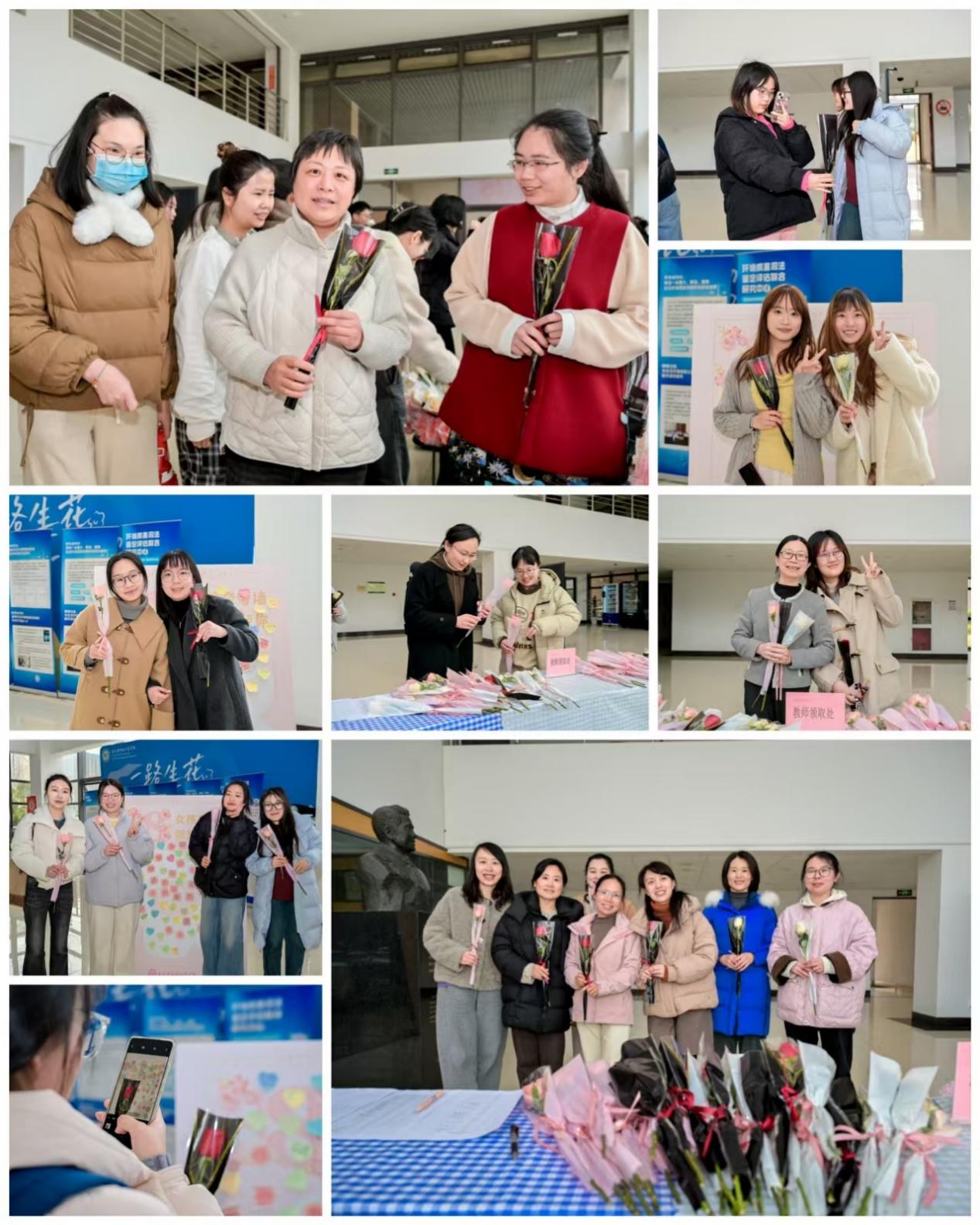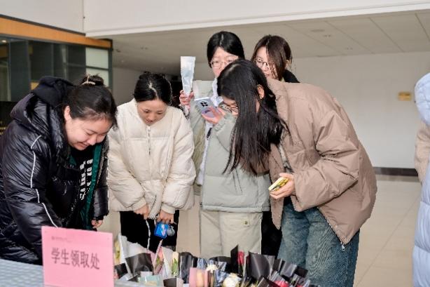 活动现场设有鲜花领取区和互动区,师生们不仅可以领取象征节日祝福的花束,还能在夸夸墙上留下对女性师友的赞美与祝福。每一束鲜花、每一句温暖的话语,让资环楼的春日氛围充满温馨。