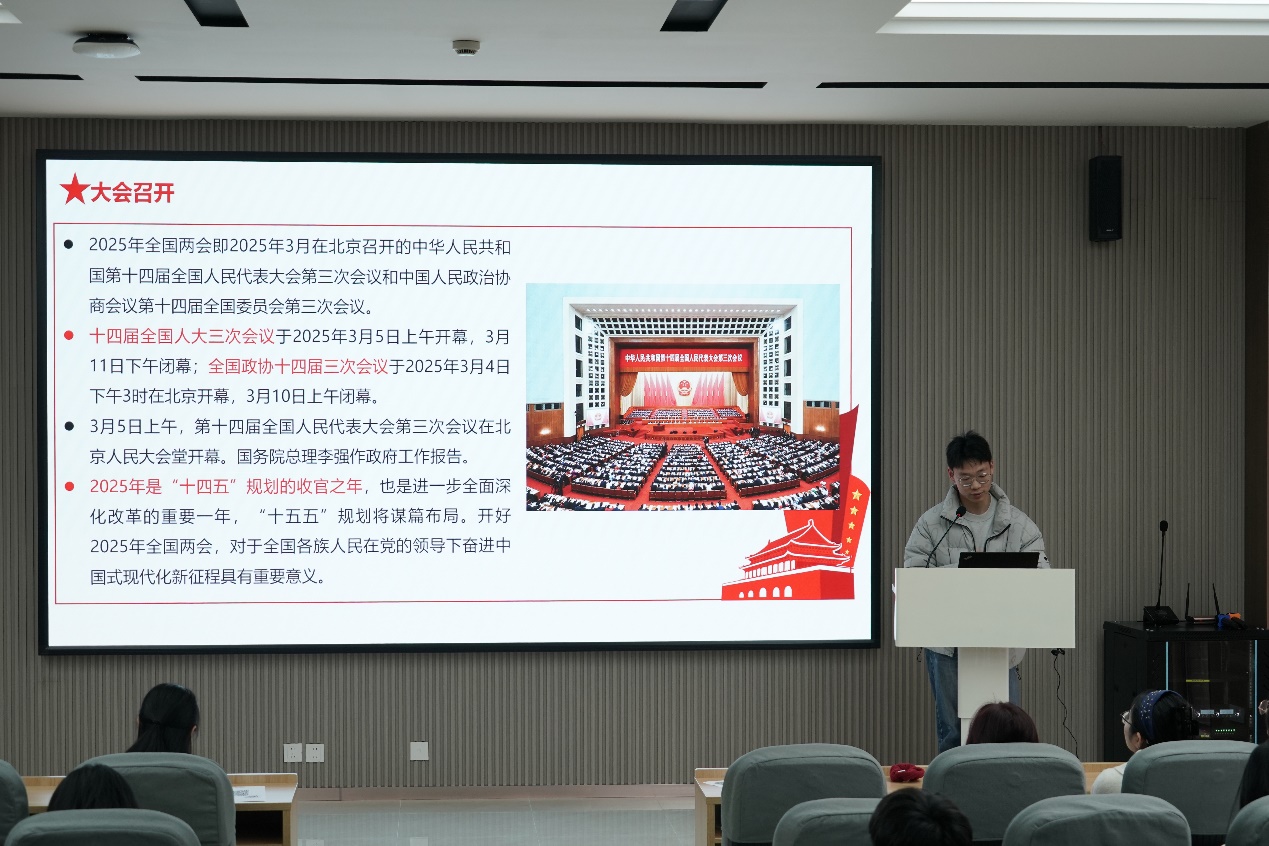 最后,孙一波同学围绕“两会议程、政府工作报告和两会就业主题”三大核心议题,深入开展了两会主题学习活动。系统梳理了“两会”及其会议议程,解读了政府工作报告中的关键要点及政策亮点,引导同学们把握国家发展脉搏。结合政府稳岗扩岗、技能培训等就业促进措施,组织同学们进行针对性研讨,从而激发同学们对未来职业发展的思考。