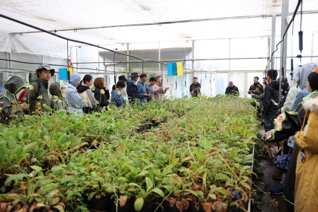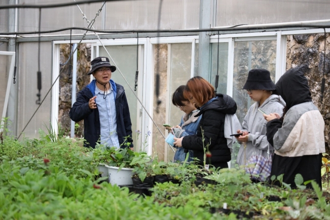 丽江高山植物园明升平为师生介绍珍稀物种、珍稀中草药保育温室情况