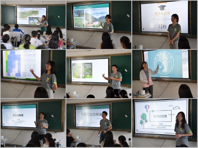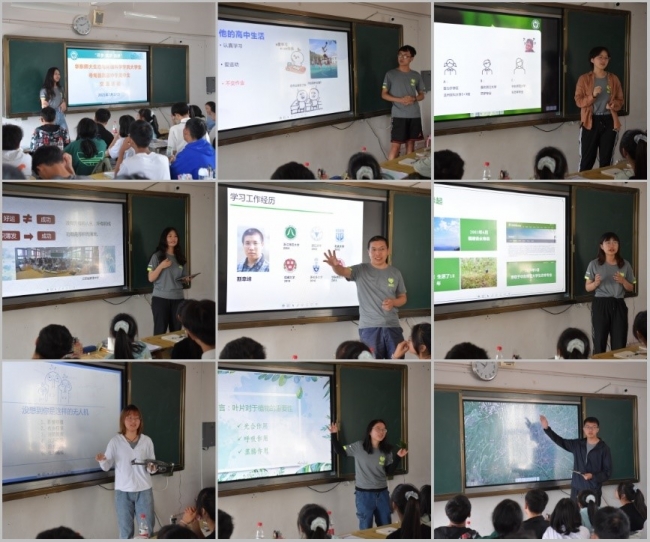 的情况,播放了2021年华师大的招生宣传片《圆的故事》,一段通过手绘漫画讲述不断认识自身、不断拓宽认知边界的故事,鼓励高中生们要不断成为更好的自己,接受更广阔世界的光,看到更大的世界。金泉泉、尹世浩等6位学生分为两组在两个班级开展“走近大学生”板块的分享,他们结合自己的高中和大学学习体会分享曾经的困惑和“豁然开朗”的心得。汪艺洁、林彤等8位同学分为两组在两个班级开展“生环小课堂”板块的分享,他们结合两周以来实践课程中的收获分享了自然的魅力、动植物的奇妙“智慧”、野外调查研究中无人机和红外相机等技术的有趣运用等,带领高中生体验一段“探索自然之旅”。张健和斯幸峰老师分别在两个班级带领同学们领略了“自然是最好的学校”和“无限风光在险峰”,两位老师丰富的求学经历、精彩的实践探索、有趣的科研故事引得同学们掌声连连,短短几分钟就“吸粉”无数。