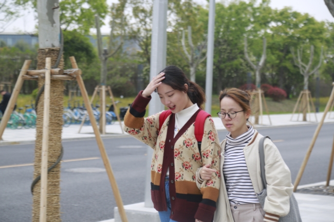 中午12:50,老师和同学们在紫竹高科技园区入口集合。本科生被分为两组,一组先进入紫竹高新区展示中心参观,另一组对其附近的老蒋家浜水质进行监测,两组结束后再交换进行监测和参观。