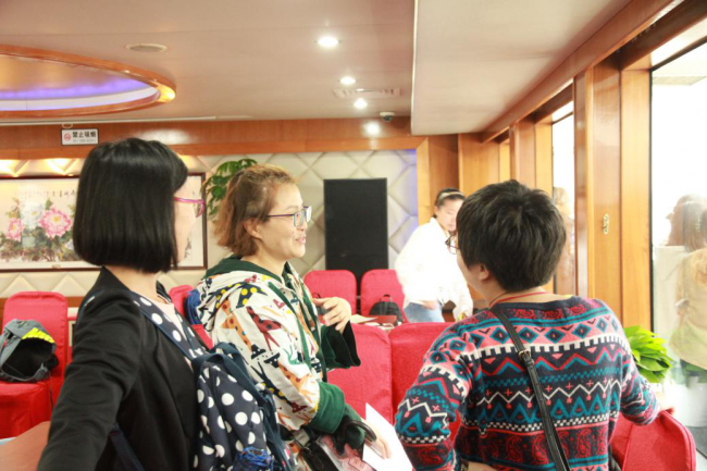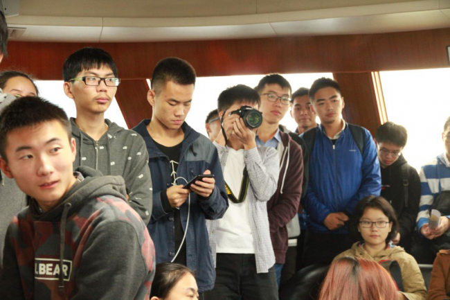 在船舱甲板上参观交流的老师们