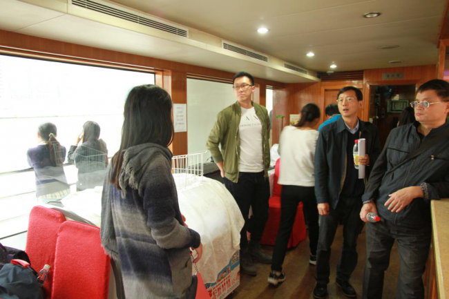 在船舱甲板上参观交流的老师们