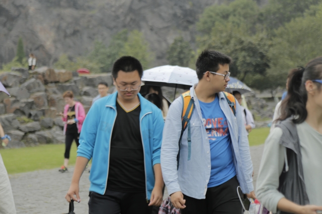 同学们“成双成对”地漫步在细雨中