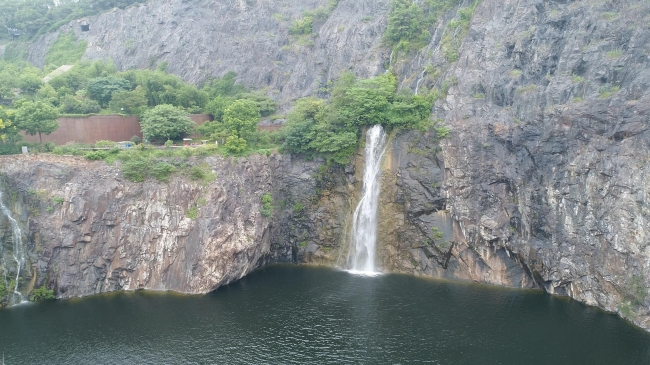 经柳林老师介绍,矿坑花园面积约39000平方米,这里原来是辰山采石场的西矿坑。根据原有生态地貌改造成了镜湖区、台地区、望花区和深潭区四个区域。矿坑花园具有优良观赏特征的乔木、低矮灌木和草本植物,包括蔷薇科、石蒜科、忍冬科、锦葵科、马鞭草科、锦葵科、菊科等1000多种植物。早在二十世纪五十年代初至八十年代中期,辰山南坡被用作开采建筑石材的场地,采石挖掘后留下东西两个采石场遗址。其中西侧采石区在山体开采完后,又向地下纵深挖掘,深入地面六十余米,形成了面积达10000平米的人工深潭,潭水水面离地面30余米,深30余米,悬崖峭壁高30至100米。