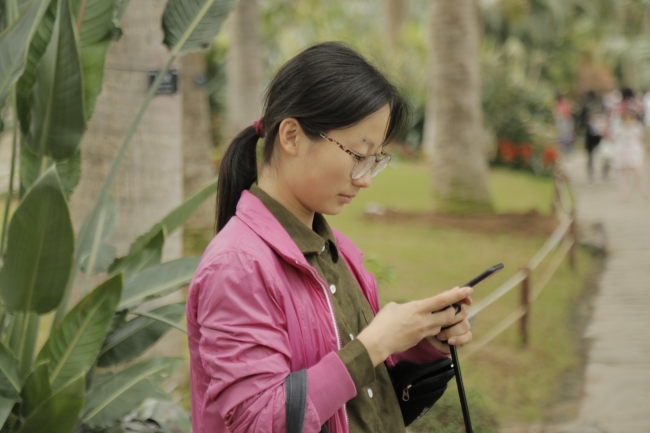 与植物合影留念的同学们
