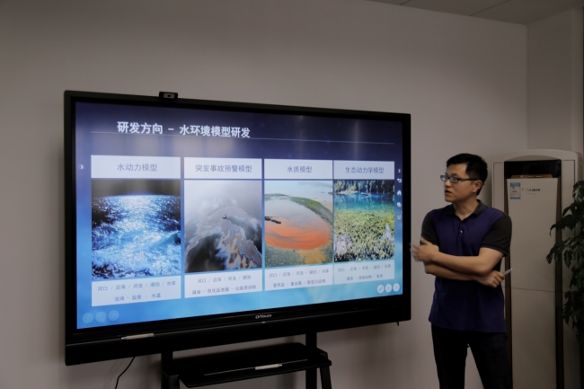 结束了两个实验室的参观后,最后一个参观的是环境规划与标准研究所的水污染模拟工程技术中心。研究所拥有一批国际先进地表水环境数学模拟和污水处理数学模拟系统,可以开展一维、二维和三维水动力与水质、生态(富营养化)数值模拟实验研究,该系统基于大量的数据,通过突发事故的模拟为环境风险评估、突发事故应急决策的制定和事故后的生态损失评估提供科学依据。