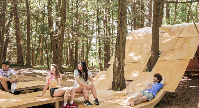 这是由一系列连续的木层压板拱结构与板结构组成的大地装置,形成了一个可以用于展览或表演的灵活空间。木层压板方案由超过 60 片约 6 毫米厚的胶合板组成,这些胶合板经过弹性变形处理后层压在一起,形成像素化的弯曲拱形结构。木层压板由数字方式构建而成,以模仿木材的自然弯曲状态,每六块木层压板组合形成一个“波浪”形态。它完美地嵌入了景观中,被森林植物群包裹着,似乎早早就存在于此,待人发现。