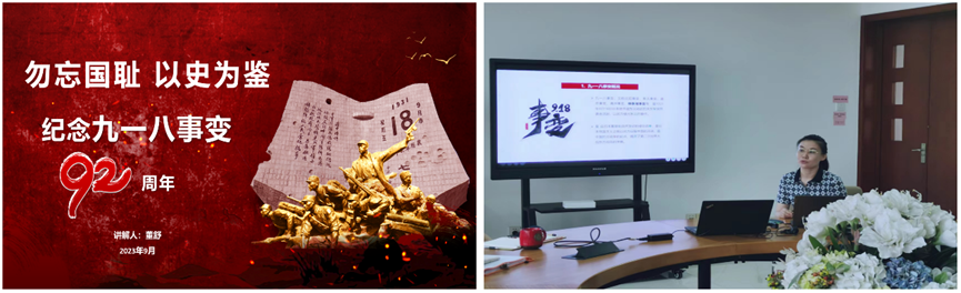 董舒以“勿忘国耻 以史为鉴-纪念九一八事变”为题,带领大家回顾了九一八事变始末。她通过皇姑屯事件、中东路事件和国共对峙局面全面分析了九一八事变发生前的时代背景;又通过柳条湖爆炸案、东北沦陷和锦州撤离等事件,详细介绍了九一八事变的整个经过,让支部老师们对九一八事变有了更详细具体的认识。最后为大家讲解了九一八事变后,赵一曼、马占山等英雄的抗战故事,带领大家向铁骨忠魂的英雄致敬。最后,通过介绍沈阳九一八历史博物馆,激励老师们不忘历史、警钟长鸣,以史为鉴、开创未来。