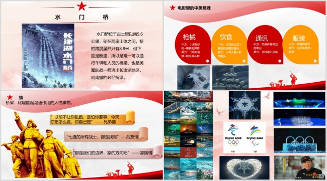 在《情与桥——观<长津湖水门桥>有感》中,施卉晰老师分享了2022年春节期间上映的电影《长津湖水门桥》的观后感。在电影的基础上,施老师还结合《冰血长津湖》、《血色军魂—长津湖战役纪实》、《长津湖战役》等影片和纪录片向大家详细介绍了长津湖战役这段波澜壮阔的历史,使支部党员对抗美援朝战争有了更深刻的认识,对该段历史脉络有了更清晰的了解。结合中国桥文化的历史、桥在战略中的重要地位,施老师向大家讲述了红军飞夺泸定桥、七七卢沟桥事变、解放上海中的四川路桥激战等几场和桥相关的重要战役。“为了下一代人不打仗,我们的任务就是打完这场仗,带他们回家……” 在感受到战争残酷的同时,更要明白如今盛世是无数中国军人的牺牲换回来的。时至今日的冬奥会,强大的国家让我们能够自信地展现出中国人的风采。大家被志愿军战士的钢铁意志和英勇无畏的战斗精神,体现出的爱国主义精神深深震撼和感动,是一次深刻的党性教育和精神洗礼。