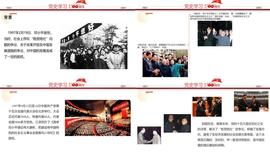 第十三讲“高擎旗帜向未来——中共十五大历史回顾”由管理与支撑教工党支部党员王娟讲读。王娟老师为大家介绍了十五大召开的历史背景、大会主题、会议议程和取得的理论成果。党的十五大是在中国改革开放和社会主义现代化建设发展的关键时刻召开的一次承前启后、继往开来的大会;是高举邓小平理论伟大旗帜,保证全党继承邓小平遗志,坚定不移地沿着十一届三中全会以来正确路线胜利前进的大会。十五大首次使用“邓小平理论”概念,并提出了社会主义初级阶段的基本纲领,规划了跨世纪发展的战略部署。大会通过的《中国共产党章程修正案》明确规定把邓小平理论确立为党的指导思想。中共十五大对于动员全党和全国各族人民团结奋斗,把建设有中国特色社会主义事业全面推向21世纪具有重大意义。