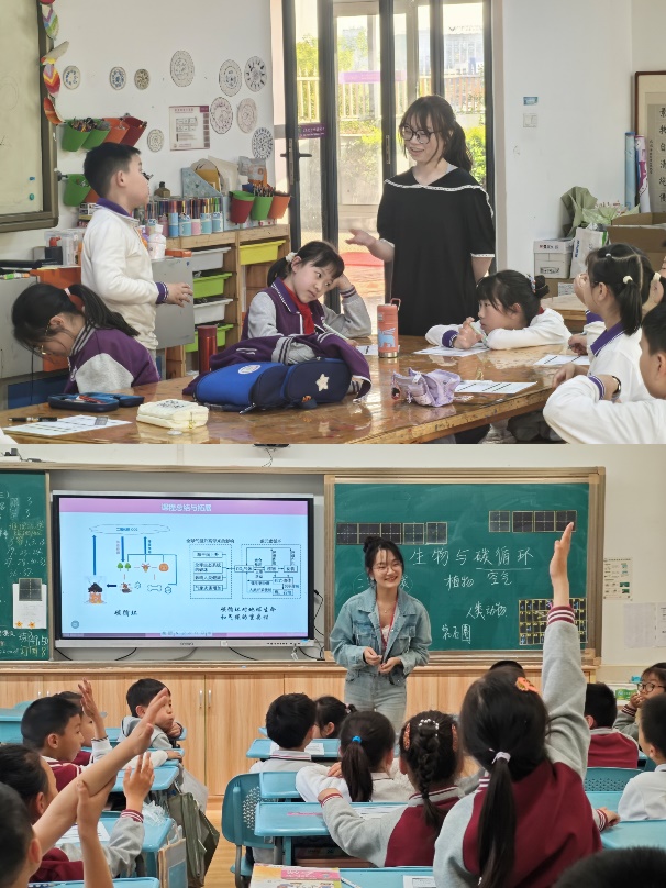 “原来二氧化碳也会‘环球旅行’!”在生环小课堂上,几十双亮晶晶的眼睛正追随着小讲师们的手势,展开了一场关于碳循环的奇幻冒险。