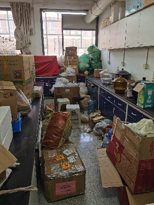 大部分实验室存在实验垃圾大量堆放、没能及时送储的问题。实验垃圾应按照回收要求分类放置,并及时下单送储,不能堆放在实验室或过道里。