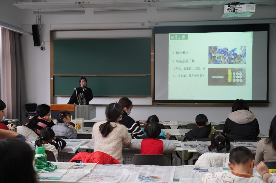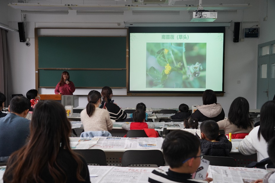 活动的第二站,小朋友们来到了四教207。小罗老师在教室里为家长和小朋友们开展植物科普。小罗老师通过展示自己出野外拍摄的植物照片,从常见可食用植物及农作物、严重入侵植物、常见木本植物、常见栽培花卉、不起眼的野花等层面,对我们身边常见的植物进行了讲解。通过一张张照片,小罗老师从自身经历讲述了每个植物的故事,不仅给我们带来了视觉上的“植物盛宴”,更是让小朋友们对身边的植物有了初步的了解,感受到了植物世界的奥秘。