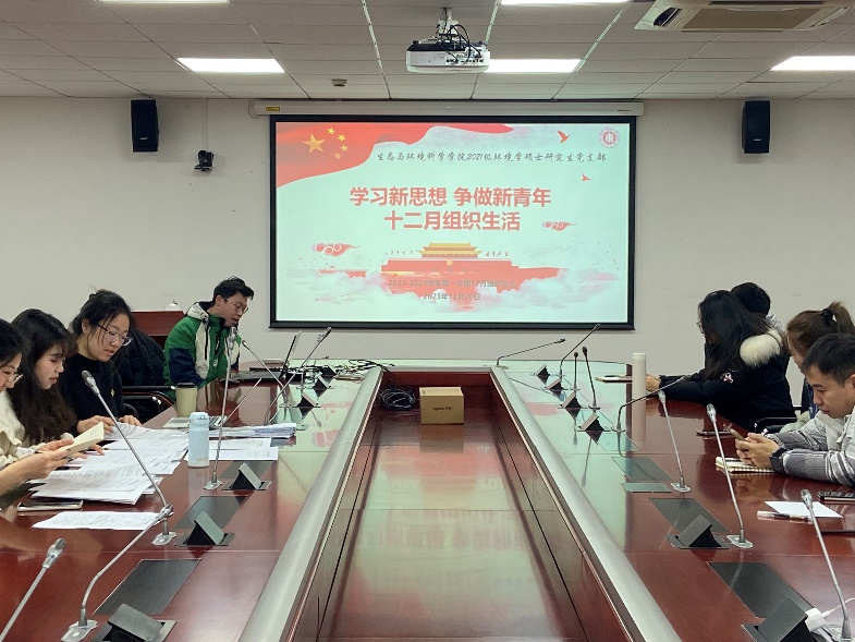 2021级环境学硕士研究生党支部于闵行校区资环楼345室开展十二月组织生活。本次活动以“学习新思想,争做新青年”为主题,包括“时政要闻分享、主题党课学习”两个环节。本次活动由第五党小组主持,全体党员到场参会。