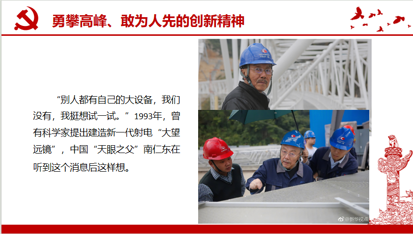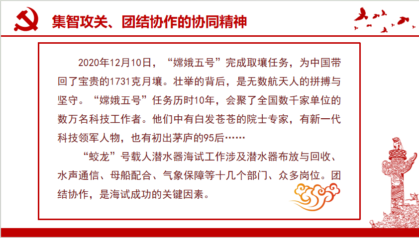 第六部分:甘为人梯、奖掖后学的育人精神。一代又一代科学家之间传递的不仅有知识、方法,更有支持青年科技人才在重大科研任务中“挑大梁”的精神和“门风”。中国科技工作者集智攻关、团结协作,才创造了举世瞩目的科技成就。