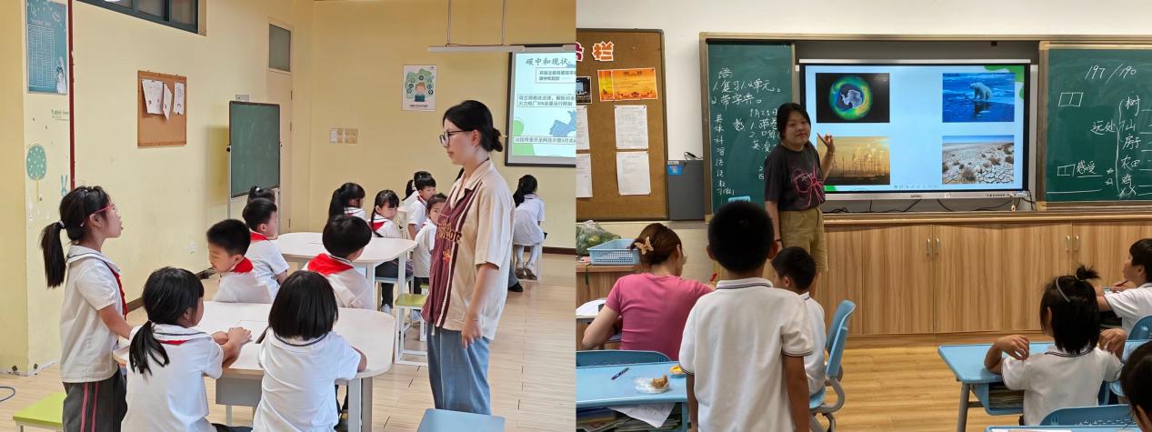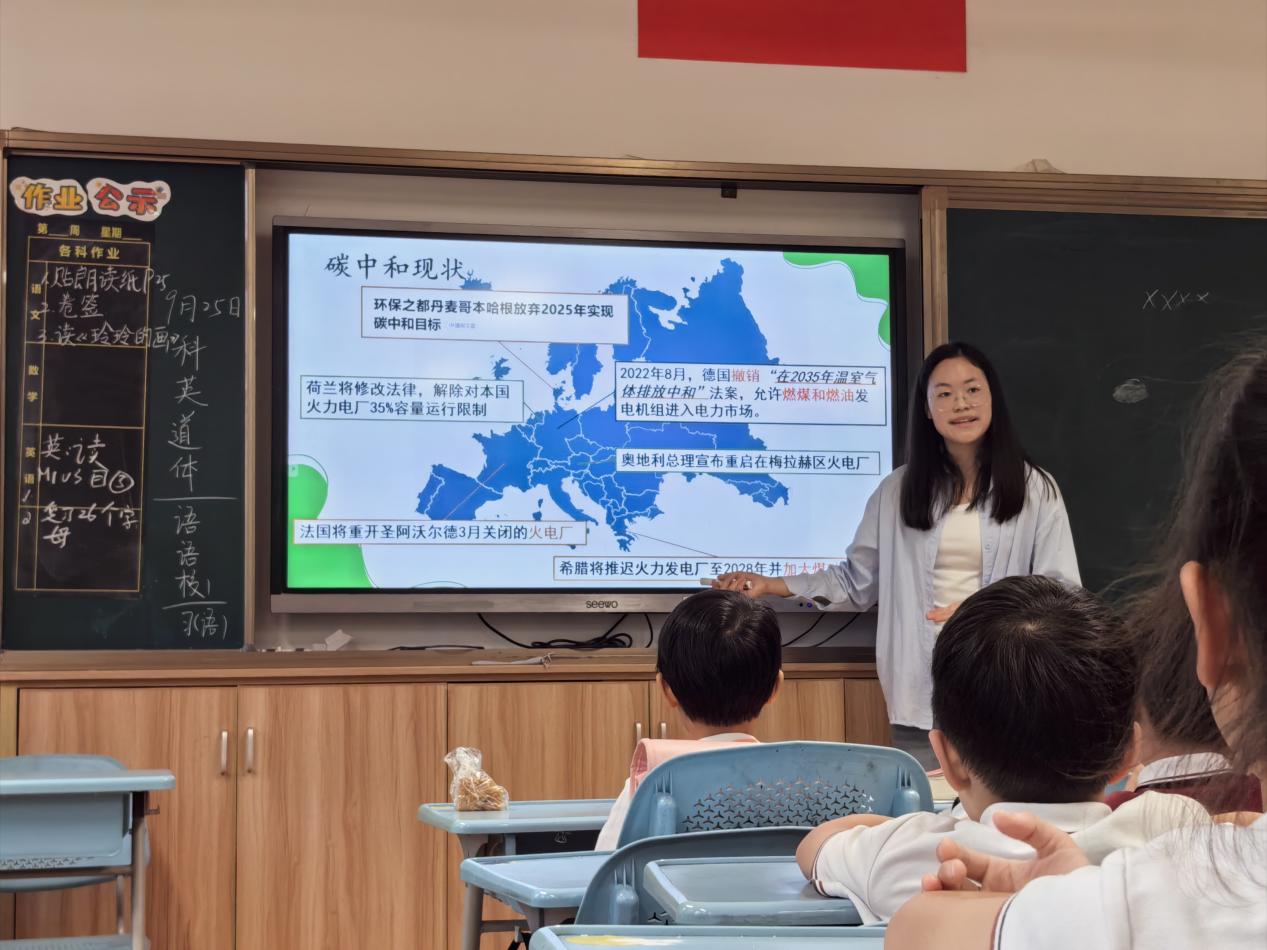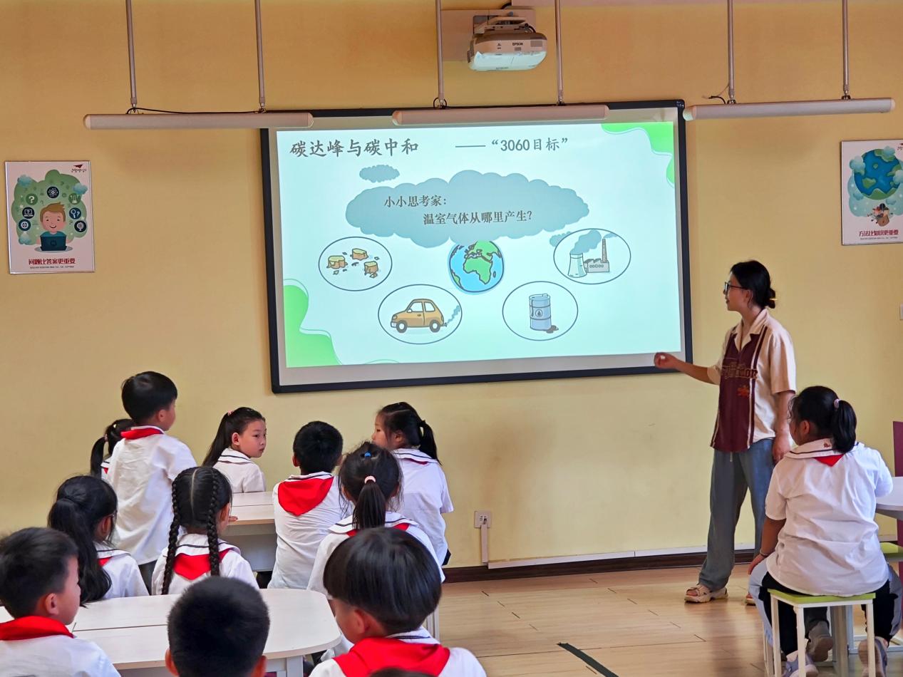 借助直观的折线图与温室气体知识讲解,老师们阐释了中国的“3060目标”——即二氧化碳为主的温室气体减排蓝图。同学们在掌握碳达峰与碳中和概念后,积极分享了个人的节能减排生活举措。