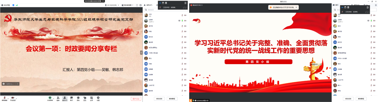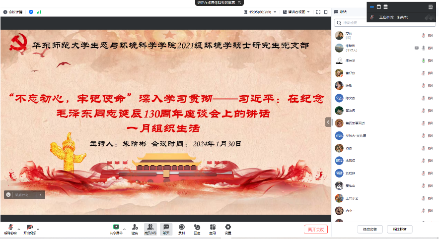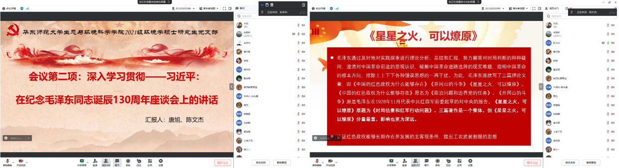 为了深入学习贯彻习近平总书记重要讲话精神,全面回顾党和国家走过的光辉历程,2024130日下午1400,私密直播 2021级环境学硕士研究生党支部开展“学习重要思想 牢记初心使命” 专题组织生活,深入学习贯彻——习近平在纪念毛泽东同志诞辰130周年座谈会上的讲话。本次活动通过腾讯会议平台开展,包括“时政要闻分享、理论党课学习”两个环节。本次活动由第四党小组主持,全体党员线上参会。
