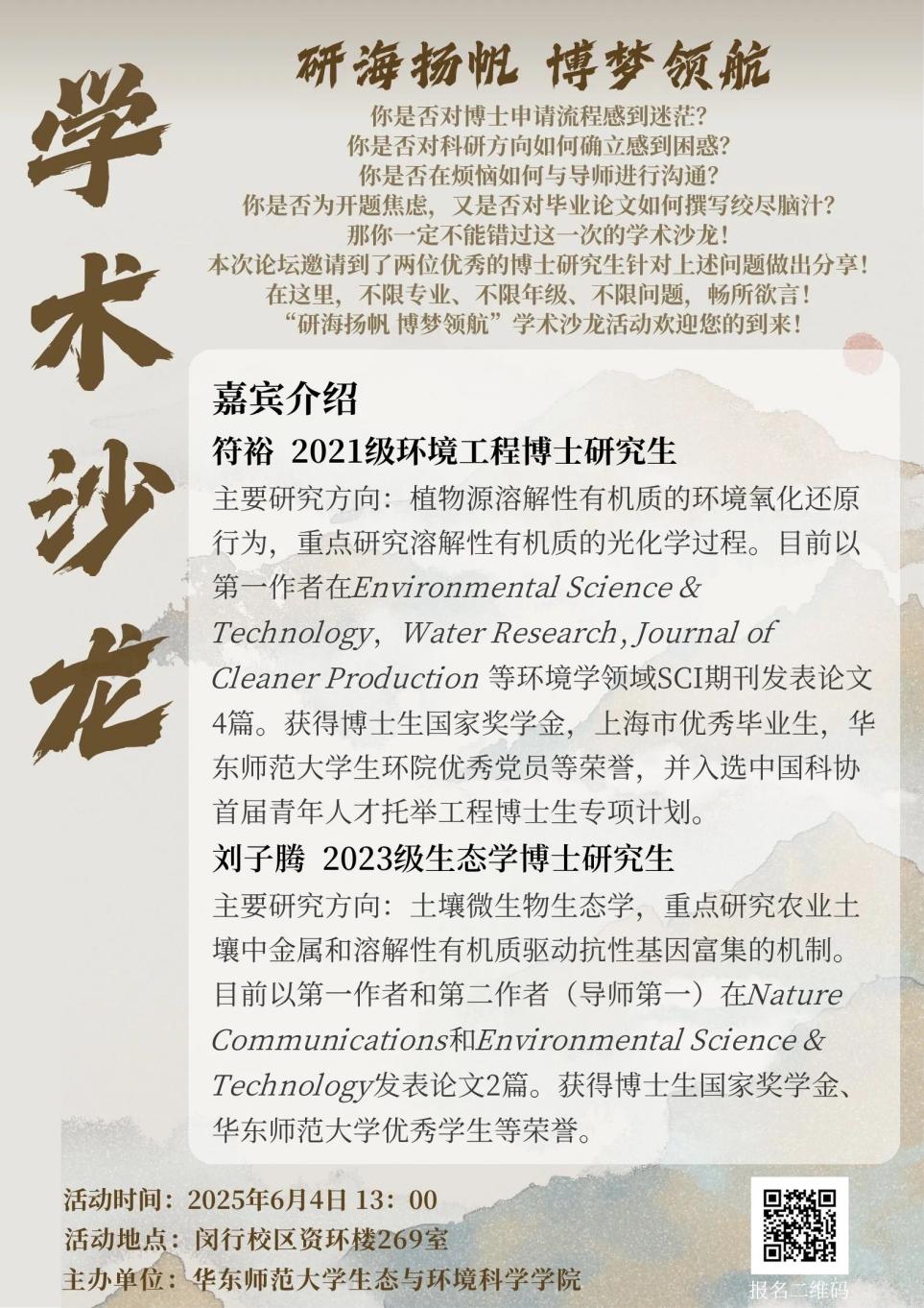 2025年6月4日下午13:00,私密直播 研究生会携手2023级生态学、环境学硕士研究生团支部,在资环楼269室成功举办“研海扬帆,博梦领航”研究生学术沙龙。本次沙龙特邀符裕、刘子腾两位优秀博士研究生作为嘉宾,为大家分享开题报告撰写和论文写作经验,活动由学术部阮文亮同学主持。