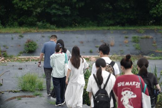 7月8日上午,营员们前往智能生态水湾参观,王强老师向营员们介绍了互花米草治理、海三棱藨草种植等海岸带生态修复技术,以及河道治理,水下森林修复等生态技术的应用案例。紧接着,同学们走进上海廊下郊野公园农林水乡劳动教育实践基地,同学们沿着农林水乡林间的木栈道,一路走一路听黄莹莹老师和赵午阳学长对农林水乡各处净化作用与水质变化情况的讲解,考察调研生态修复项目,学习生态环保知识。