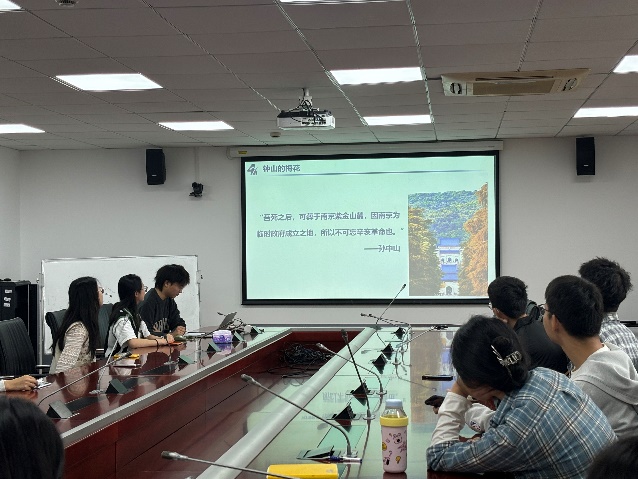 活动第三部分,杨辰雨向大家分享了中山陵。孙中山先生逝世前夕曾说过“吾死之后,可葬于南京紫金山麓,因南京为临时政府成立之地,所以不可忘辛亥革命也。”如今孙中山先生长眠于中山陵,见证着南京的日新月异。在中山陵的至高点是中山先生祭堂,中间是一尊孙中山先生的大理石坐像,孙中山先生身着长袍马褂,端手持长卷,他深邃的目光凝视远方,将整座金陵城尽收眼底。而新街口广场中央的孙中山雕像“屹立于繁华,见证百年沉浮”,在阳光下熠熠生辉。中山先生铜像庄严肃穆,挺拔的身影与南京这座城市的脉搏融为一体,与南京人民一起走向未来。