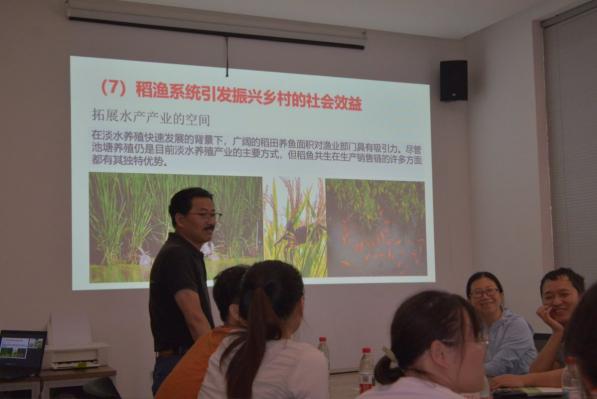 于是,浙江大学稻渔生态研究团队将教学、科研和推广延伸到田间地头。以胡亮亮老师为代表的青年学者,用专业知识为乡村特色发展按下“快进键”,让稻渔共生系统既富口袋又护地球。胡老师向同学们介绍到稻田是大气甲烷(CH₄)的重要来源,水稻的植株特性是影响稻田甲烷排放的关键因素。面对全球变暖的严峻挑战,他带领团队针对稻渔系统的气体减排难题开展了定位研究。团队提出“高—低甲烷品种间作”新思路:在不影响产量的前提下,通过精准配对CH₄高排放与低排放水稻品种,调节根际微环境,实现“增产+减排”双赢。他们把论文写进泥土,把数据换成农民听得懂的增收账,让“稻渔共养”真正接了地气,也让我们更多人看到:青年只有把专业扎进土地、晒在太阳下,才能成为乡村振兴最实在的底气。