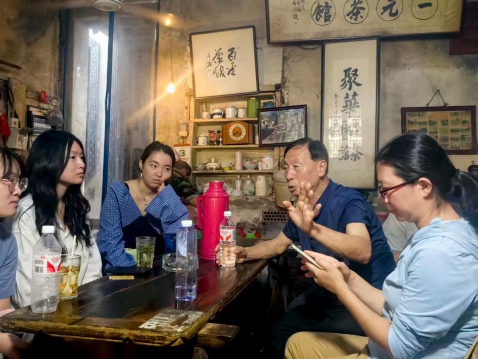 章金财先生在“一元茶馆”为同学们介绍荻港村的发展历程