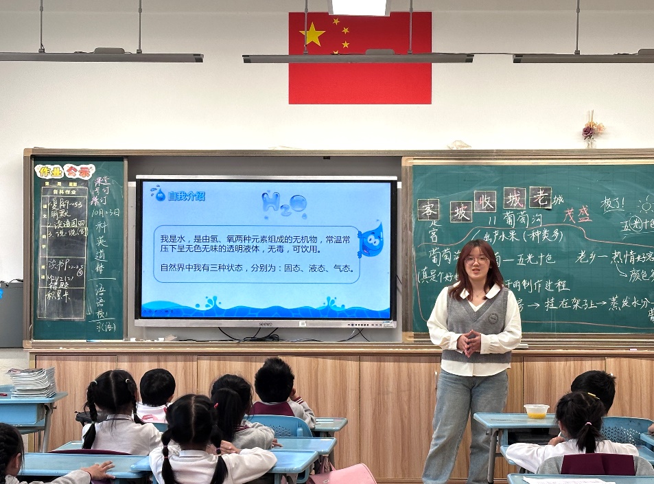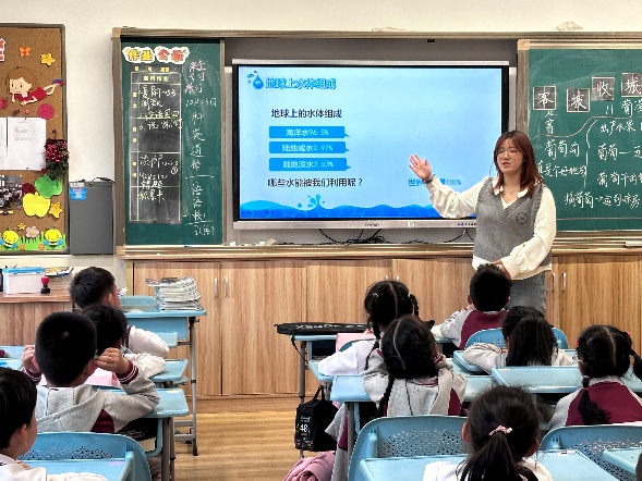 课程开始,讲师们先向同学们介绍了水的组成和水循环的过程,通过趣味视频和示意图展示了蒸发、水汽运输、凝结、降水、地表径流和下渗等水循环的具体流程,帮助同学们更好地理解。讲师们特别设置了“考一考”环节,同学们积极踊跃地举手回答问题,分享自己的见解。