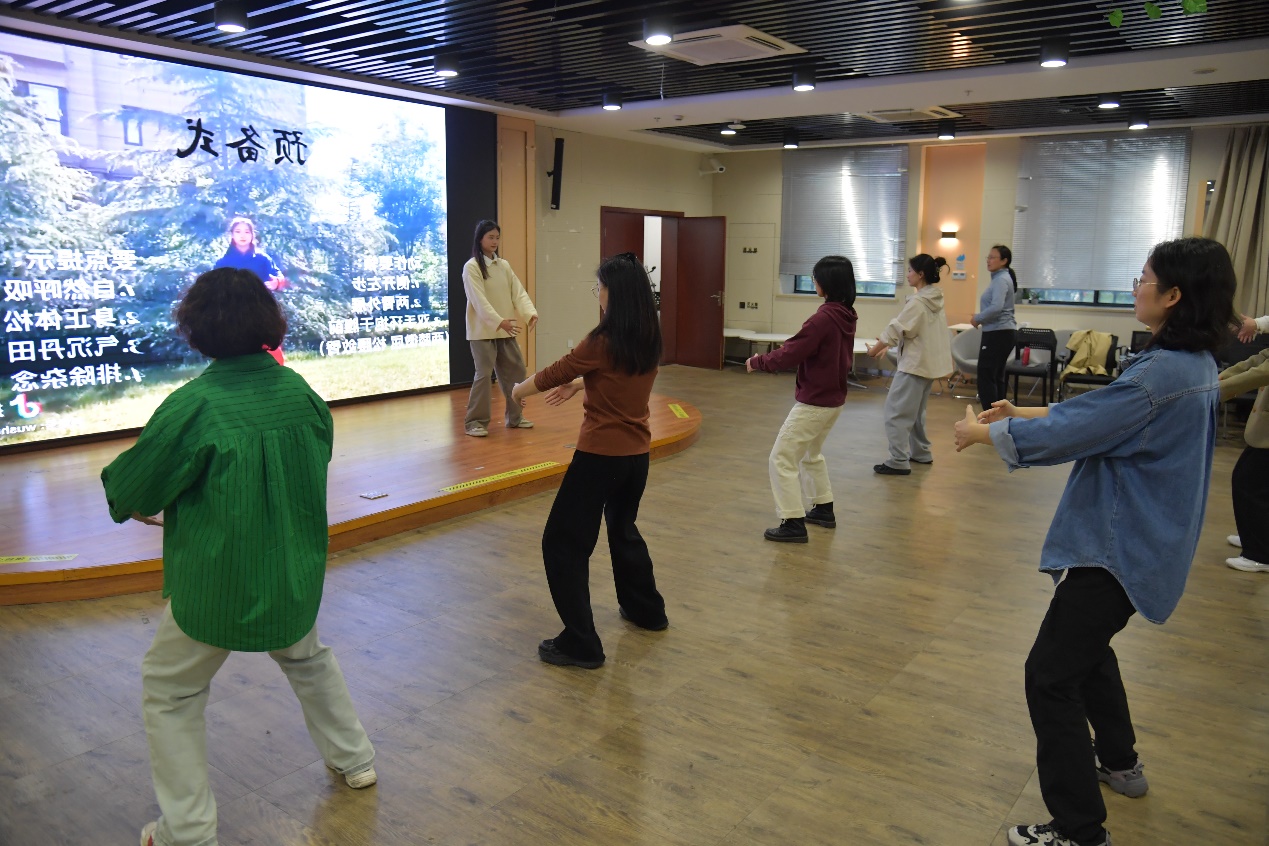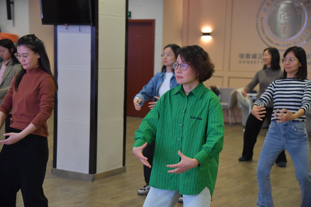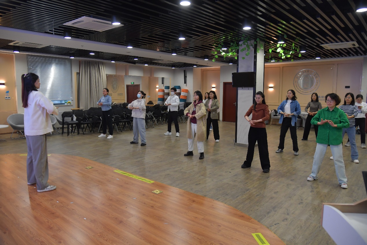活动正式开始前,老师、同学们在周教练的带领下开展热身活动。八段锦是形体运动与呼吸运动相结合的一种独特健身法,传承久远,通过宣畅气血、展舒筋骼而达到运动养生的目的。热身结束后,周教练结合教学视频对每一式进行拆解,详细地介绍动作并做示范。她告诉大家呼吸要与动作配合,全套动作宜柔、宜缓,用专业清晰的动作口令引导大家,老师和同学们都觉得收获颇丰。