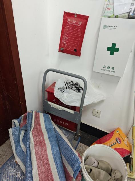 8 | 实验室环境: ①地面潮湿有水容易滑倒; ②过道严重堵塞,存在消防隐患 |